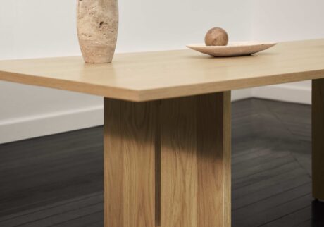 「日本のコンパクトな住まいでも空間に過度な圧迫感を与えることなく、限られた空間にも馴染みます。円形のダイニングテーブルは、動線を確保しやすいので特に使いやすいでしょう。また収納家具は異なる空間や用途に柔軟に対応できるので、ぜひ活用してほしいです。装飾に頼るのではなくシンプルで、自然素材を用い、クラフトマンシップを大切にした今回のコレクションはきっと、同じ価値観を持つ日本のインテリアを愛する方々にも受け入れていただけると考えています。オーク材とトラバーチンの素材のコントラストや、重さを感じさせずに存在感を生む建築的なプロポーションにも、ぜひ注目してほしいです」