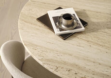 「コレクション全体に採用したオーク材は、空間に温もりをもたらします。ラウンドテーブルには、トラバーチンも採用。彫刻のような存在感と、時を重ねても変わらない安定感を与えてくれます」