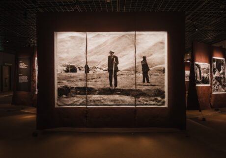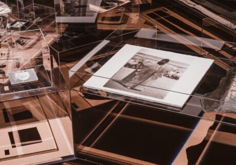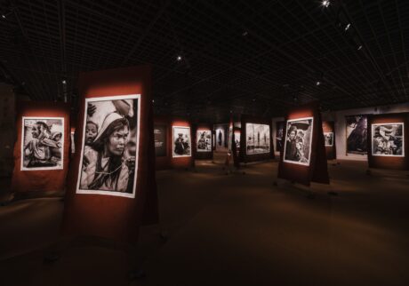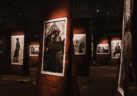 空間の構成を手がけたのは、建築家の田根剛さん。約40年にわたり多くの展覧会を支えてきた会場の歴史に光を当て、仕切りの壁を取り払い、コンクリートや空調ダクトをあえて露出させている。そこに、竹和紙にプリントした写真を一枚ずつ手作業で縫い付けた布を配置。泥染めのファブリックを使用するなど布選びにもこだわっており、動きのある柔らかな質感と無骨な空間の対比が印象的な空間だ。また、会場で使用しているアクリルボックスやカーペットは、過去の展覧会で使用されてきた物品をリユースしたもの。コラボレーターたちの美意識や環境への配慮が隅々にまで行き渡っている。