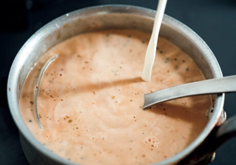 「母が作ってくれたチャイもスパイスは欠かせないものでした。頭痛がするときに、黒胡椒をしっかり効かせて作ったりしていて。体調や気分に合わせてベーシックなチャイにスパイスを調合するんです。そうした考え方は、僕が作るチャイの基本になっています。ネパールの本場の味は、牛乳が特徴的で。水牛のものを使っているので、そこが日本とは一番異なるところ。水牛が牧場に放し飼いにされていてキャベツやなすなど、そのときどきの季節の野菜を食べているんです。だから、水牛のミルクにもその匂いがする」