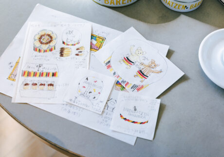 福田里香(以下、福田):今回、塩川さんと作った〈DEAN & DELUCA〉のクッキー缶に入っている焼菓子「ベーレンタッツェン」は、ドイツ語で「くまの手」(ベーレン=熊、タッツェン=手)を意味する、ドイツの伝統菓子です。缶にくまを登場させたいなと考えていたのですが、塩川さんのタッチで描いたくまが見てみたいと思い、缶のイラストをお願いしました。