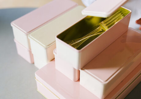 福田:今回、家から持ってきた東京・半蔵門『村上開新堂』のクッキー缶は、カトラリー入れとして使っています。ロゴやイラストが入っていない、潔いシンプルなピンクが美しい。経年変化による色落ちも愛おしいですね。何個か持っていて、買ったタイミングで色合いに違いが出てくるのも楽しいです。