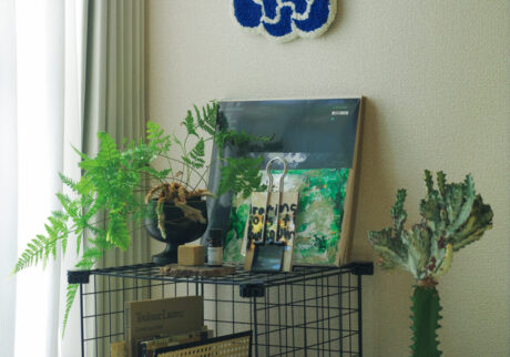 「ひとり暮らしを始めてグリーンが好きになりました。ベッドの近くのコーナーにガラスのテーブルを置き、植物や花瓶を並べて。少し置くのではなく、“埋めつくす”くらいのボリューム感がポイント。このコーナーが家のシンボルです。そこでお香をたいて、好きなアートブックを眺める時間がリラックスになる。あまりに居心地が良すぎて、外に出られなくなっちゃうんですよね(笑)」