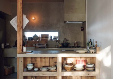 「有機的というのでしょうか、食を扱う場所なので、その感じがいいなと思って。作業台兼食器棚も造作してもらいました。整理整頓がさほど得意ではないので、収納はざっくり