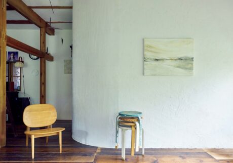 件の白壁はDIYの集大成のような存在でもあり、「古民家には基本的に曲線がないので、アールのついた仕切り壁はこの家を象徴する存在になってくれるのではないかと」。