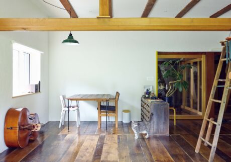 岐阜・飛騨高山の中心地から車で30分ほど。小さな集落に佇む築70年の古民家が白石達史さん、実果さんの住まいだ。趣のある引き戸を開ける。上がり框(かまち)の先には古材の貫禄を窺わせる板廊下……実は古民家然としているのはここまでで、廊下の右手には30畳ほどの明るいリビングが広がる。ハンス・J・ウェグナーのソファやチェアが置かれ、左手にある緩く弧を描く白壁が印象的だ。