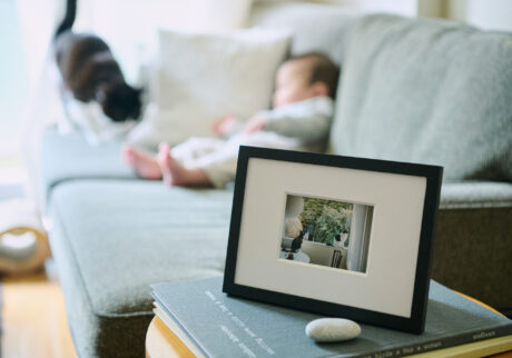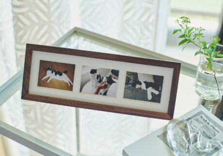 今回飾ってみた3種類のフレームはすべてタテ、ヨコどちらも楽しめて、壁に掛けることもできるので、それぞれを組み合わせて飾ってみるのもひとつ。「日々スマートフォンでもカメラでも、日常を切り取っているつもりでしたが、ちゃんと見返す機会がないのはもったいない。『+precious』なら、程よい存在感で佇まいも良いし、プリントの仕上がりも美しいから、どんなインテリアの家でも自然と溶け込んでくれそうです」と二人は語る。