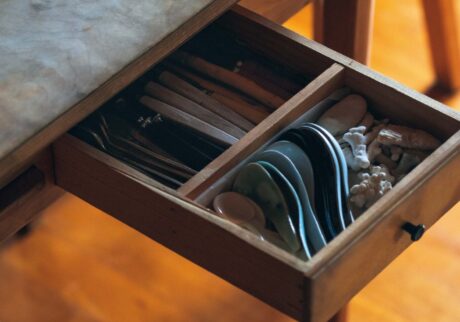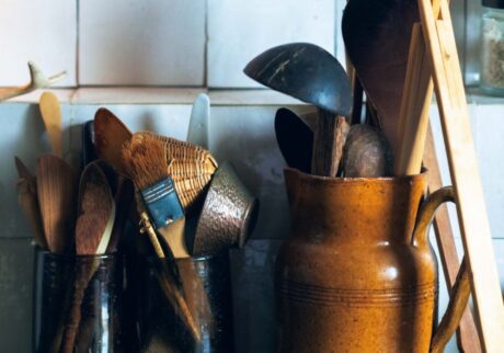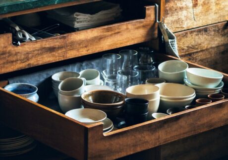 東京から山梨に移住し、自然を感じる時間が増えたことは、台所のしつらえの色を選ぶうえでも影響があったそう。たとえば、作業台に選んだモスグリーンの大理石天板や温かみのあるトーンの白いタイル、収納に用いたヴィンテージ感のあるこっくりとした色の木材など。