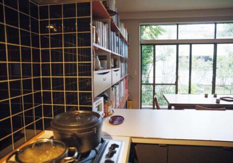 「もともとは台所と食事するスペースが壁で仕切られた、昔ながらの閉鎖的な間取り。その壁をなくし、レッスンで大人数分の料理もしやすいように奥行きのあるカウンターを造作し、ゆったりとしたコの字型のオープンキッチンにしました。調味料や道具類は、無駄な動きがないように準備や調理、盛り付けなど動線を考えて収納。また、以前からの黒タイルの壁や横長で広いシンクは、気に入っていたので生かすことに」