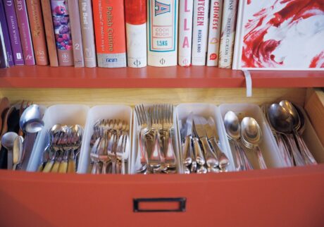 さらに、小堀さんは長年愛用してきた家具も、この家のキッチンになじむようにリメイク。増設したカウンターの下には、20年前から使っている北欧のヴィンテージチェストを設置し、両サイドにはラタン扉の収納を加えた。壁はお気に入りの床と揃えてテラコッタ色に塗り、その前には、料理にまつわる本を色別にグラデーションで並べた圧巻の本棚が。