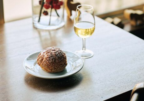 この通り沿いで、仕事の後や友人との待ち合わせによく立ち寄るのが、レトロビルの一室にある『メトン』。「スイーツもお酒も楽しめる、懐の深いお店。デザートならシュークリーム、仕事終わりのビールを飲みたいときは甘くないマドレーヌサレの生ハム添えを」