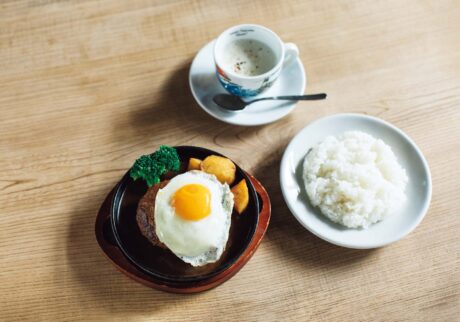 2025年11月に旧店舗のほぼ向かいに移転リニューアルした『イノツチ洋食店』(左京区頭町337‒79)。看板メニューの鉄板ハンバーグ(目玉焼きトッピングで¥1,700)は季節野菜のポタージュ付き。寺の境内に位置し、風雅な庭が望める。