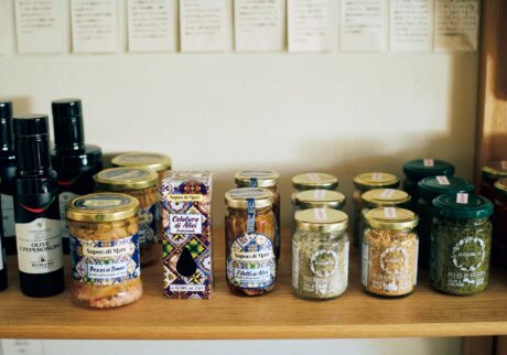 人を引き寄せる、ゆるやかな水辺のリズム。京都・鴨川、ローカルガイド。後編 | 『マニーナ』では、母体であるレストラン『チェンチ』で愛用する品を中心にオリーブオイルやアンチョビ、パスタといった上質なイタリア食材がそろう。「手土産を買いに来たつもりが、目移りしてしまい、自分用にも欲しくなります」