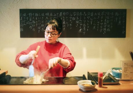 人を引き寄せる、ゆるやかな水辺のリズム。京都・鴨川、ローカルガイド。後編 | 「店主のなおさんの安定感ある接客と鉄板さばきで、カウンターながらくつろいで飲んでしまいます」という居酒屋『とよこや』(中京区清水町352‒4)。野菜炒め(¥900)にポン酢と生卵(¥100)をつけて食べるのが酒向さんのお気に入り。