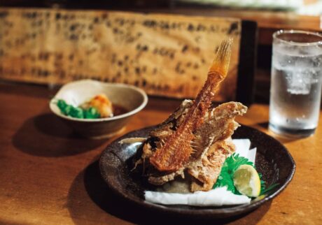 骨までカリカリに揚げられたカレイのから揚げ(¥1,000)と芋焼酎「さつま白波」のソーダ割(¥700)の組み合わせが、『赤垣屋』でのお決まりという酒向さん。「ナスにしん など、京都の味を街の先輩方に教えてもらったのもこの店」