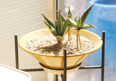 庭の窓辺に並ぶ鉢植えは、多肉植物のクライミングオニオン、ブルセラ・ファガロイデス、ブーファン・ハエマンソイデスなど個性派ぞろい。「仕事柄、つい見た目のユニークさに惹かれて選んでいるところはあるかもしれません。あとは、色合いも重視。ニュアンスカラーといわれるような、単純ではない色が好みで、グリーンでも、青みがかっていたり、グレイッシュだったりするものは、すぐ手に取ってしまうんです」