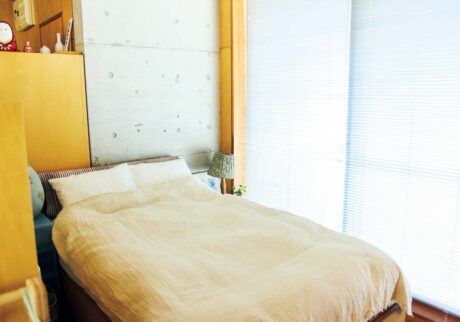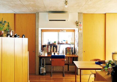 インテリアデザイナー・佐々木達也さんが妻の夏海さんと暮らすのは、都内にあるデザイナーズマンションの一室。壁の大部分にはバーチ材のパネルが格子状に張られていて、残りの一部と天井はコンクリート打ちっぱなし。木の温もりとモダンな質感が違和感なく共存し、入って早々にどこかほっとする。大きな窓から差し込む光も気持ちよく開放感があるが、この部屋はわずか34㎡のこぢんまりとしたワンルームだ。玄関から一歩足を踏み入れてすぐにあるのがダイニングルーム。間仕切りを兼ねる収納棚を隔てて水回りとベッドスペースがあり、その先はベランダというコンパクトな間取り。「工夫しながら整えていくうちに、この小さな家の心地よさに気付きました。今の二人にはちょうどいいです」と、達也さんはいう。