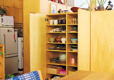 ともにインテリア関係の仕事に長く携わってきたこともあり、どうしてもものが増えてしまいがちだという佐々木さん夫妻。それでもこの家がごちゃごちゃとしていないのは、〝隠すところは隠す、見せるところは見せる〞 というメリハリが利いた空間になっているから。洋服や食器、家電などの生活感が出やすいものは、仕事机を挟むように作り付けられた大きな収納と、件の間仕切りを兼ねる扉付きの棚に収めた。一方で、旅先や骨董市などでつい集めてしまうという小物類は、出窓のサッシや収納の上などをうまく使いながら並べている。以前は〈ミナ ペルホネン〉のショップスタッフとして店頭に立っていた夏海さんはいう。「ヴィンテージや民藝品、作家ものなどを季節や気分に合わせて出したり引いたり。お店のディスプレイ替えをしている感覚ですね。自分たちが持ち寄ったものは国も作家もバラバラですが、そこからいろんな組み合わせを考えるのが楽しいんです」