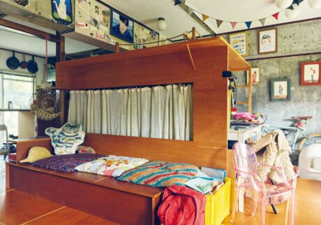 「子どもの頃押し入れで寝るのに憧れてました。下が私のスペースなのですが、このおこもり感が心地よいんです。家のプランニングをしていたときは、娘は小学3年生。彼女は『自分の部屋はいらない』と言っていたけど、成長したら絶対、自分の部屋は欲しくなるだろう、と。とても小さなスペースですが、せめて2段ベッドにして個別の空間を作ってあげようと思ったわけです」