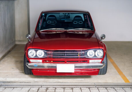 1968年から’72年に販売された3代目スカイライン、通称ハコスカ。峯野さんの愛車は’72年式。カラーはローズレッドパールに全塗装。