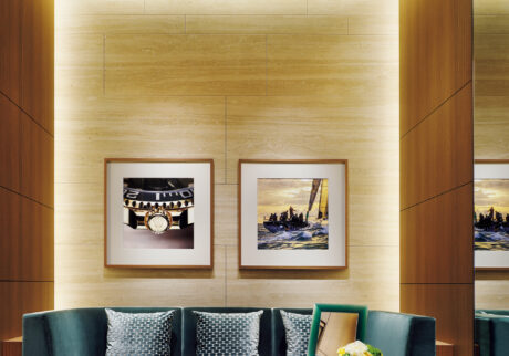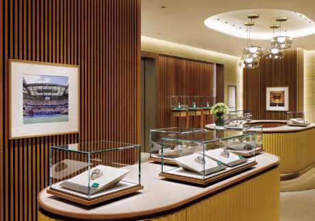 壁や椅子には、ブランドのシンボルカラーである深いグリーンを取り入れて、落ち着いた空間のアクセントに。従来の約2倍に拡大したゆとりのある売り場で、じっくりと時計選びを楽しむことができる。