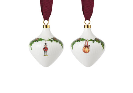 ![スターフルーテッド クリスマス オーナメント 2個セット[∅6.5×H9cm] ¥16,500 (ロイヤルコペンハーゲン) | ホリデーシーズンのアイコン「スターフルーテッド クリスマス」から、もみの木のガーランドがおもちゃの兵隊やボールでデコレーションされたデザインのオーナメントが登場。深紅のリボンがロマンティックなアクセントに。