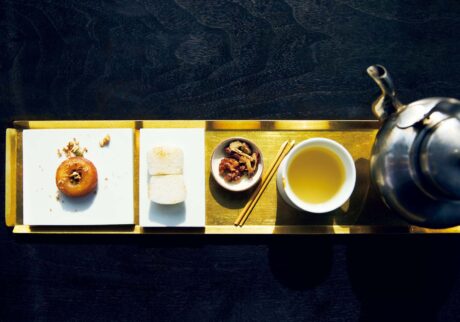 「餅への理解と繊細な技、節気にちなんだ茶菓(タグァ)と茶の組み合わせ、実家も餅店というオーナーのイ・ミョンジェさんのセンスの良さに驚きます」。オリジナル茶は季節ごとに替わり、冬は風邪予防にも作用する河東地域の緑茶を発酵させた茶に、済州島のミカンの皮、生姜などをブレンド。6品ほどの茶菓子が出る80分コースのみ。