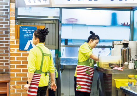 ひんやり冷え冷え。夏の暑い日には、涼を呼ぶ麺として毎日食べたくなる客続出、長い行列ができる。添えられるキムチももちろん自家製だが、「コングクスと相性がいいように、少し甘口に作っています」と、当主のお姉さんが言う。「味変的にスープに混ぜながら、とか、麺にのっけて召し上がる方もいますが、大豆の風味が損なわれるので、できれば別々に」とのこと。確かに混ぜてしまうと、一気にキムチ味に。