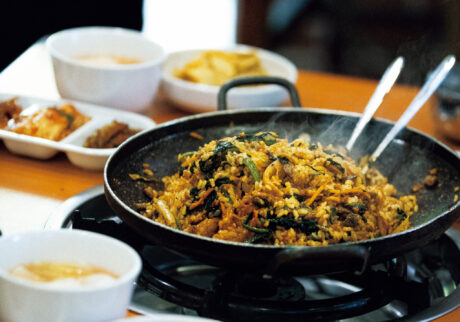 もう一つ、人気メニューを挙げるなら、キムチチャーハン。目の前で、スタッフが野菜と牛肉を炒め、ご飯も入れて手早く作ってくれる。具材たっぷりな贅沢チャーハン。友達と一緒なら、両方とってシェアするのがおすすめ。