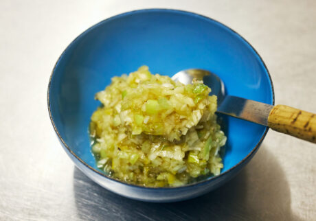 下味を付けている間に、ネギダレを作りましょう。長ねぎをみじん切りにして、おろした柚子の皮と、果汁、ごま油、塩、黒胡椒、白醤油と合わせます。柚子は皮を削ったあとに、切って果汁を絞るので、丸々1個無駄なく使いますよ。