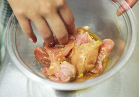 ②下味として、鶏もも肉に、酒と醤油、おろし生姜をまぶしてなじませる。