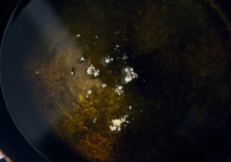 油の温度の目安は、片栗粉を落としてシュワシュワっと泡が出てくるくらい。温度でいうと170°Cが目安です。