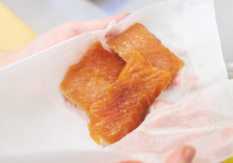 まずは鮭をカットして、下味をつけていきましょう。食べやすい大きさに切ったら、総重量の1%の塩をまぶして10分ほど置いておきます。