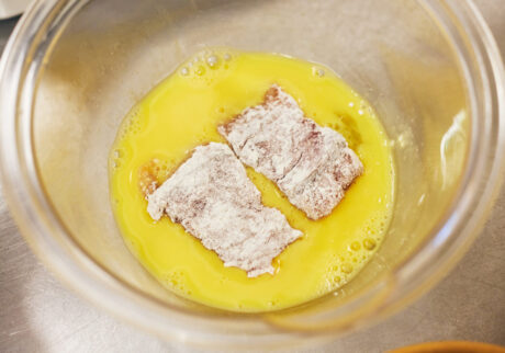 次に今回の肝、衣を付けていきます。といってもシンプルに、小麦粉、卵、いりごまの順に付けていくだけ。小麦粉ははたきながら薄く漬けて、主役のごまはたっぷりと。