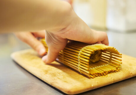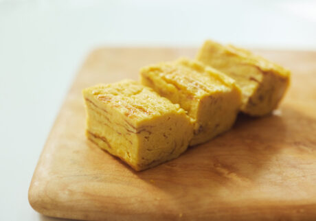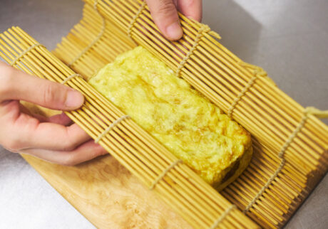 最後に甘めの卵焼き。卵をボウルに割り入れたら、鰹出汁、砂糖、薄口醤油、みりんを加えてよくかき混ぜます。卵焼き器を温め、サラダ油を引いて、5回くらいに分けて卵を流し入れます。ここまでは普通の焼き方ですが、焼き終わってからがポイント。巻きすに取り、温かいうちに形を整えます。
