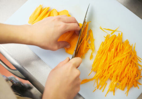 まずは人参の柑橘ラペから。人参は薄く切った後に千切りにし、全体の重さの2%の塩をまぶして10分ほど置く。その間にごまダレを作ります。酢、砂糖、塩、醤油を鍋に入れ、砂糖が溶けるまで弱火で煮立て、火を止めてからすりごまを加えます。人参の水気を絞り、ごまダレを合わせ、最後に柑橘の皮をおろして搾り汁を加えて完成。15分あればできちゃいます。