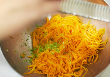 ④人参に、②のゴマだれを大さじ1加える。柑橘の皮をゼスターでおろし、搾り汁を加えて完成。