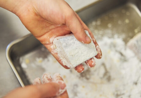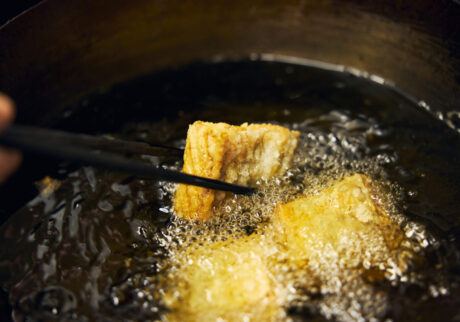 ②鰆に片栗粉をまぶし、170度の油で5分ほど揚げる。