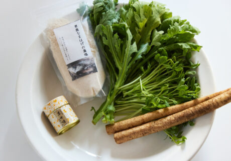 ごぼうの水気を取り、170度の油で3〜4分揚げます。その間にタレを準備。藻塩、ごま油、黒七味を混ぜておきます。最後に春菊、豆苗、揚げたごぼう、タレを和えたら完成です!今回、藻塩は地元秋田の男鹿産を。黒七味は京都『原了郭』のものを使用しました。