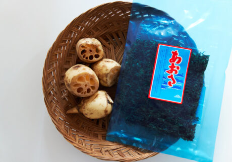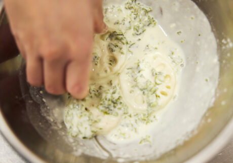 続いて蓮根のあおさ揚げを作ります。こちらもお手軽、工程はわずかです。まずは蓮根を3ミリ程度の厚さでカットし、5分ほど水にさらしておきます。衣は小麦粉、水、あおさを混ぜ合わせます。