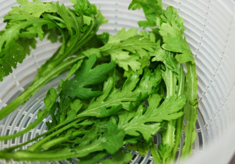 最初に春菊と豆苗の揚げごぼうナムルから。春菊と豆苗を洗ったらしっかりと水を切り、カットしていきます。春菊は3センチほどのざく切りに、豆苗は根っこを落としてさらに半分にします。主役のごぼうはささがきにして、5分ほど水につけてアクを抜きます。