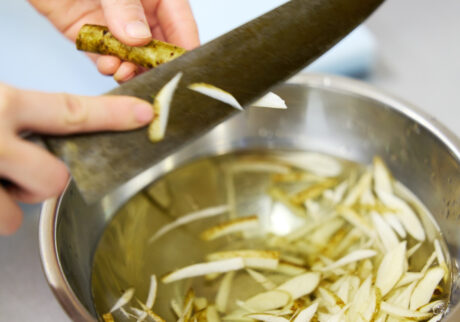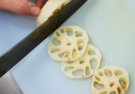 ①蓮根を3ミリ程度にカットし、5分ほど水にさらしておく。
