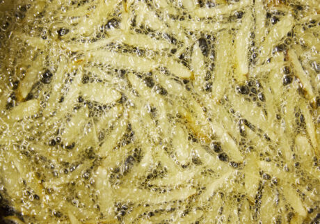 ②ごぼうの水気をしっかり切り、170度の油で3〜4分揚げる。カリカリになるまでが目安。