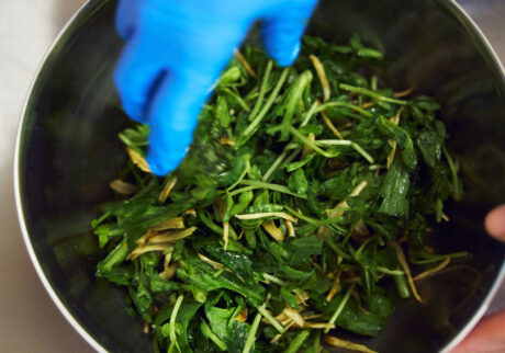 ④春菊、豆苗、揚げごぼう、タレを混ぜ合わせたら完成。