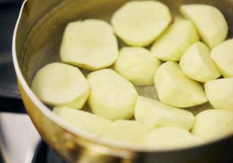 ②鍋でお湯を沸騰させたら、じゃがいもを入れ、竹串がスッと入るまで茹でる。
