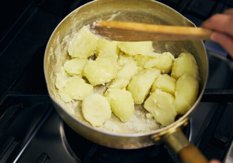 ④茹で上がったらざるにあげ、鍋に戻し揺すりながら粉が吹くまで水分を飛ばす。
