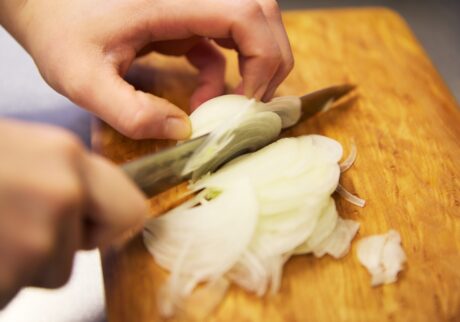 その間に、辛子明太子は中身を薄皮からこそいでおきます。玉ねぎも半分に切って薄切りにして、水にさらしておきます。10分ほど経ったら、さらしに取ってよく水気を絞りましょう。
