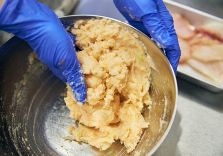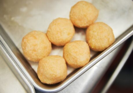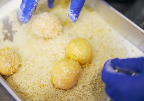 ⑦食べやすい大きさに丸め、薄力粉、卵、パン粉の順に衣を付ける。