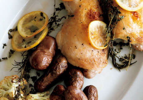 3.オーブンを200℃に温める。天板にオーブンシートを敷いてローズマリーとタイムを置き、レモンの輪切りをのせる。その上に骨付き鶏モモ肉を置き、オリーブオイル(小さじ1/2)を皮目に塗る。カリフラワーと小ジャガイモをまわりにのせてオリーブオイル(小さじ1)をふる。
