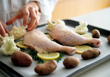 先生:オーブンを200℃に温めたら天板にオーブンシートを敷き、香り付け用のローズマリーとタイムを置いて、レモンの輪切りをのせましょう。その上に鶏モモ肉を置いて、皮目にオリーブオイルを塗ります。肉のまわりにカリフラワーと小ジャガイモをのせたら、オリーブオイルをふってください。